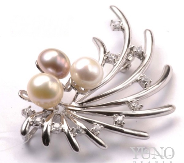 Broşă din argint 925, perle de cultură colorate 7.5-8mm, zirconii