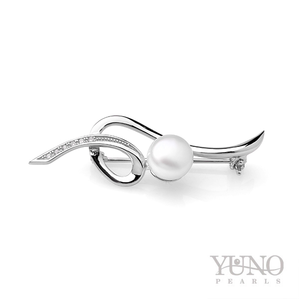 Broşă argintie, perlă de cultură albă 8-9mm, zirconiu