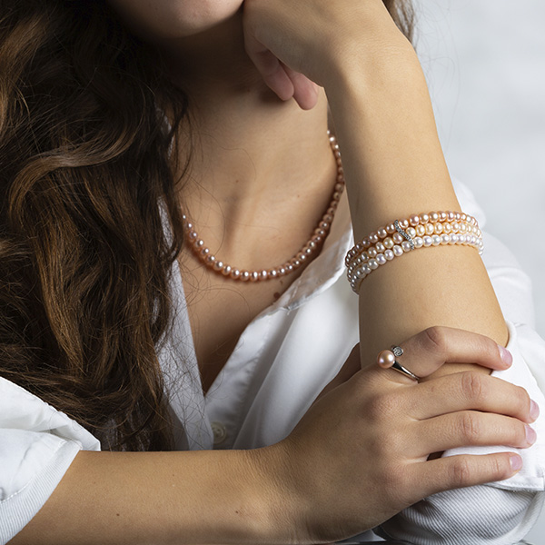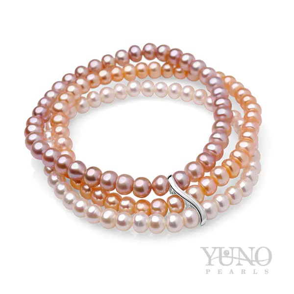 Eleganță pură și farmec discret, surprinse într-o bijuterie unică. Această brățară cu trei rânduri de perle de cultură este o celebrare a nuanțelor pastelate, îmbinând armonios perle albe imaculate, roz pal și violet-lavandă (dimensiune 5-6 mm).