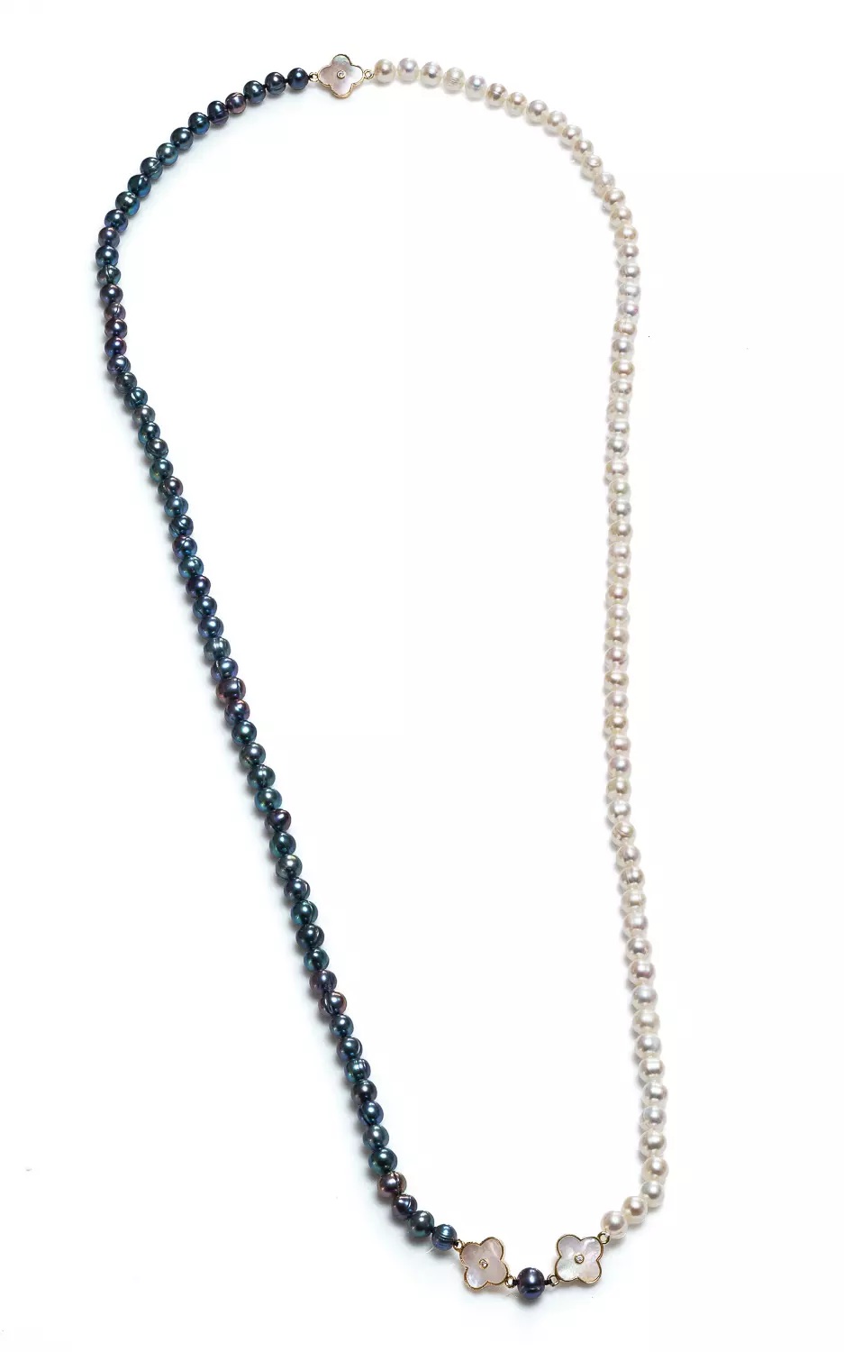 Colier cu perlе de cultură albе și culoare închisă 7-8 mm și 3 elemente de trifoi. Lungime 98 cm.