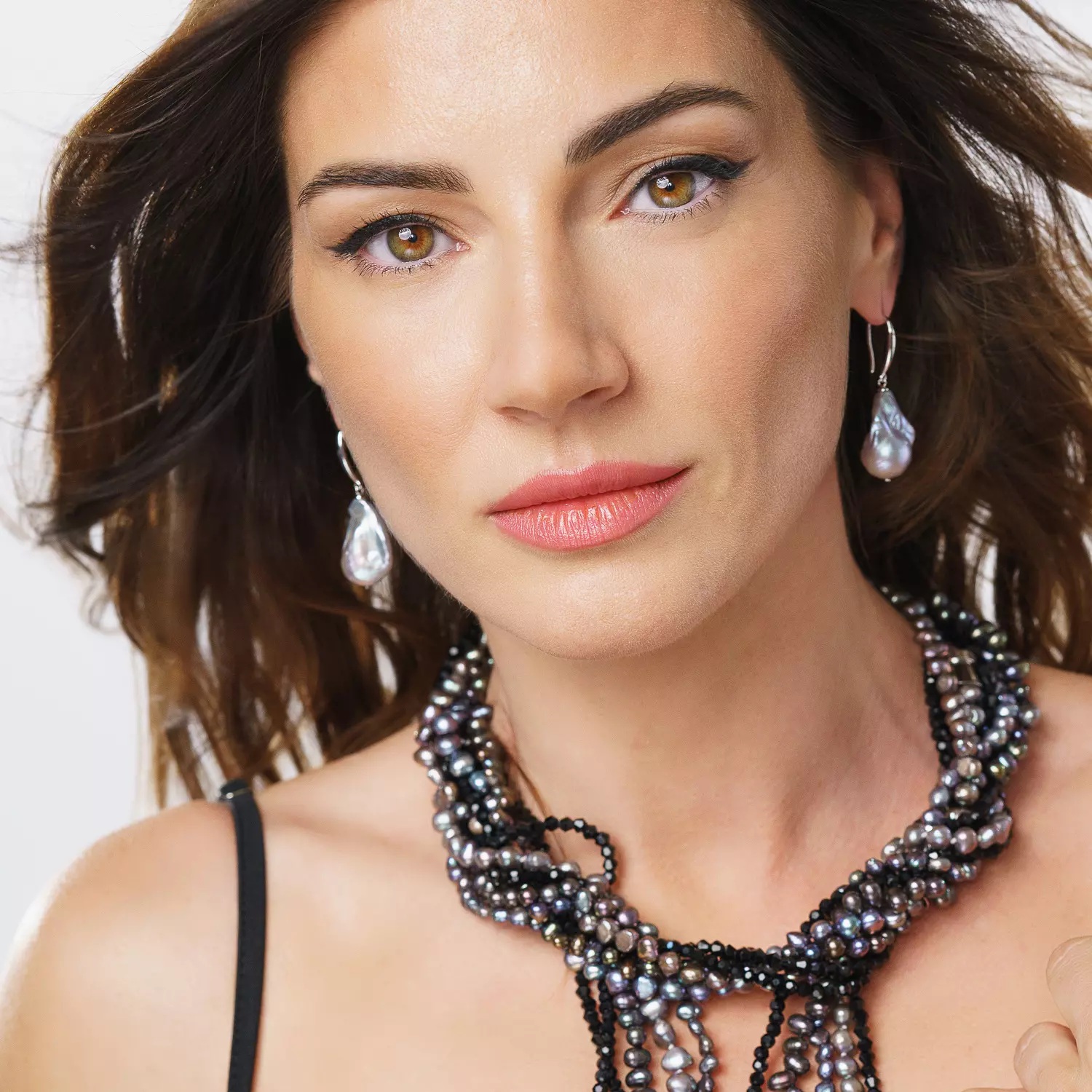 Piesa centrală a bijuteriei este o perlă barocă de dimensiuni impresionante, cuprinsă între 13 și 16 mm. Forma sa neregulată și organică face ca fiecare perlă să fie absolut unică, transformând cerceii într-o operă de artă purtabilă. Culoarea gri-lavandă a perlei oferă un luciu sofisticat și o versatilitate deosebită, completând atât tonurile reci, cât și pe cele calde.