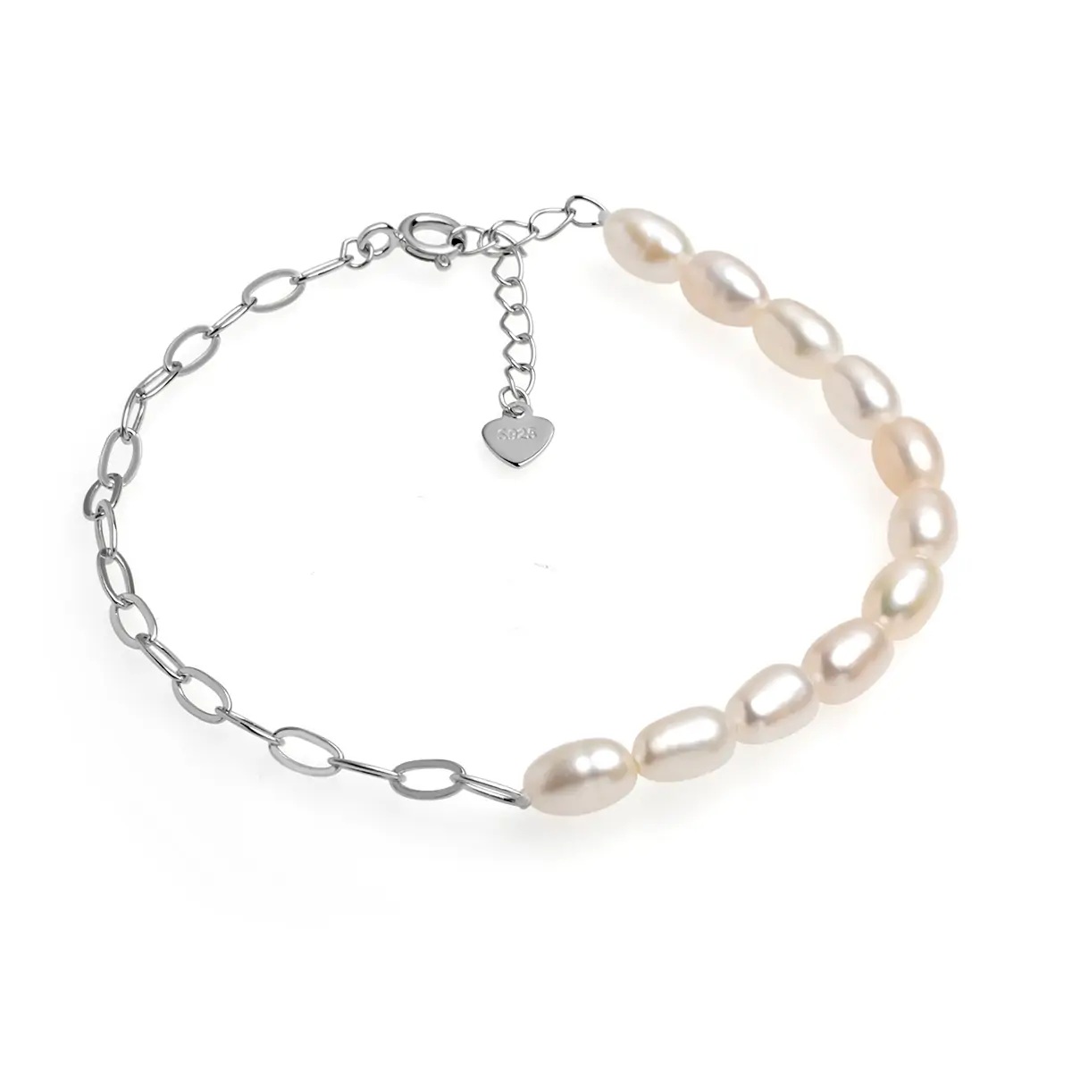 Brățară cu perle albe 4mm, lanțișor și prelungitor argint 925