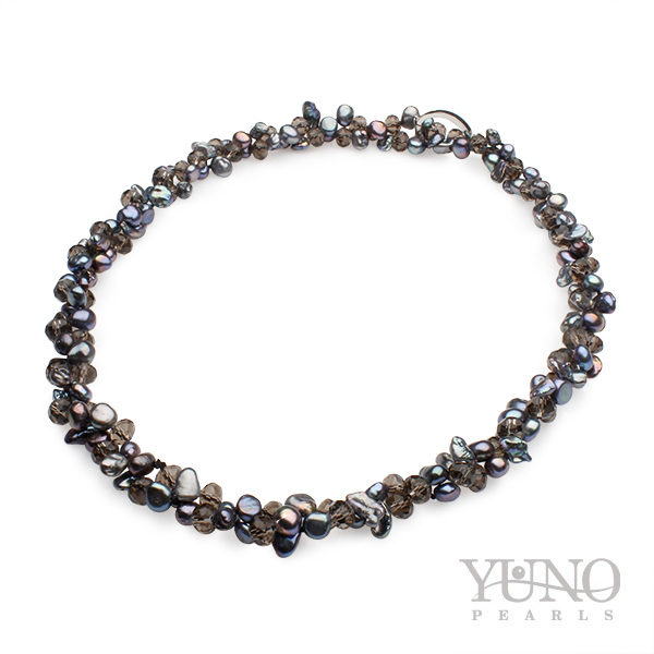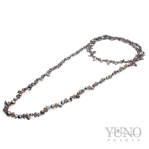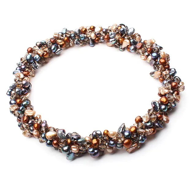 - Perle de apă dulce: Mix de perle albe, maro și de culoare închisă (peacock/negru),cu dimensiuni între 5-6 mm.