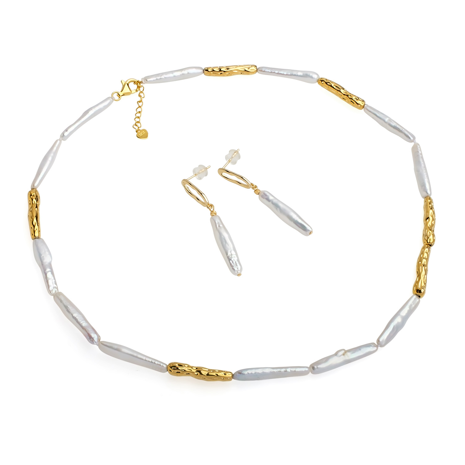 Set de colier și cercei perle sidef de cultură albe, închizătoare și detalii placate cu aur galben, lungime 43+4cm.