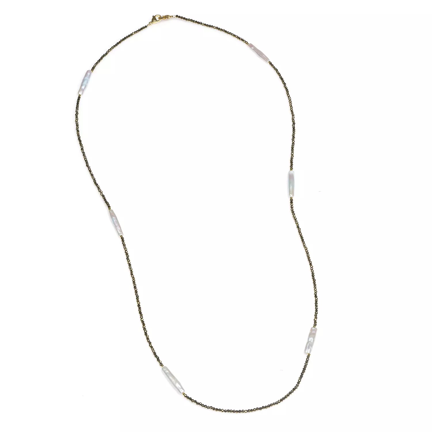 Colier cu 6 perle albe în formă de baghetă cu hematit auriu, lungime 88 cm. Aplicație 2 în 1.