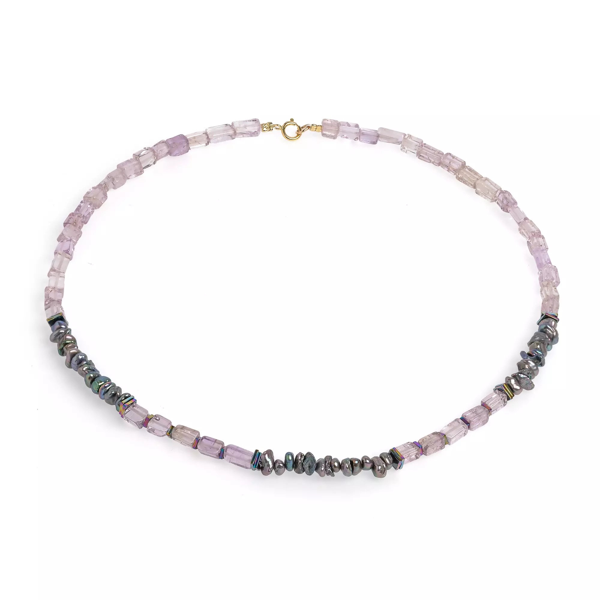 Acest colier este o întâlnire rafinată între profunzimea mistică a ametistului și farmecul rebel al perlelor Keshi. Designul mizează pe contrastul dintre tonurile delicate de liliac și strălucirea iridescentă a perlelor închise la culoare, creând o bijuterie cu un caracter artistic și nobil.