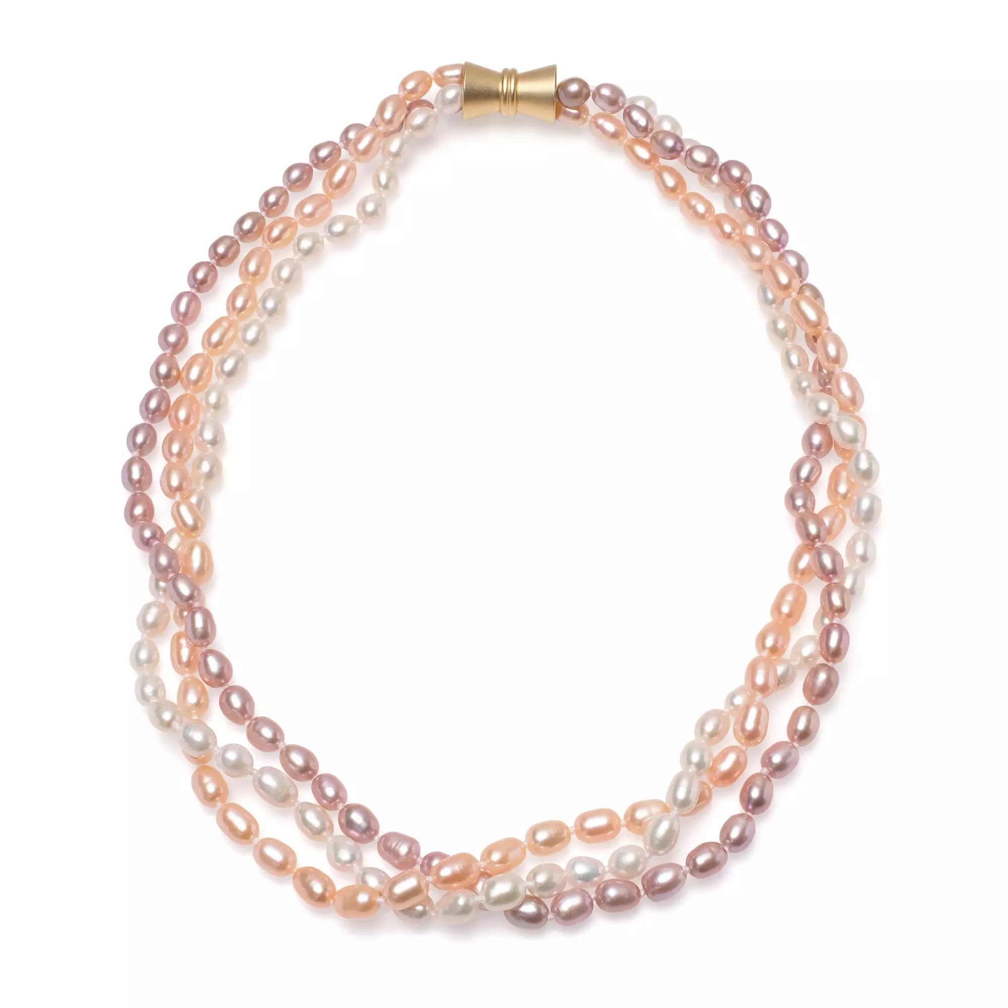 Cele trei rânduri de perle oferă un volum generos și un aspect luxuriant. Designul modern este completat de închizătoarea magnetică placată cu aur, care nu este doar un element de siguranță, ci și un detaliu estetic prețios. Fiind un mix de culori naturale, se asortează ușor cu o gamă largă de vestimentații.