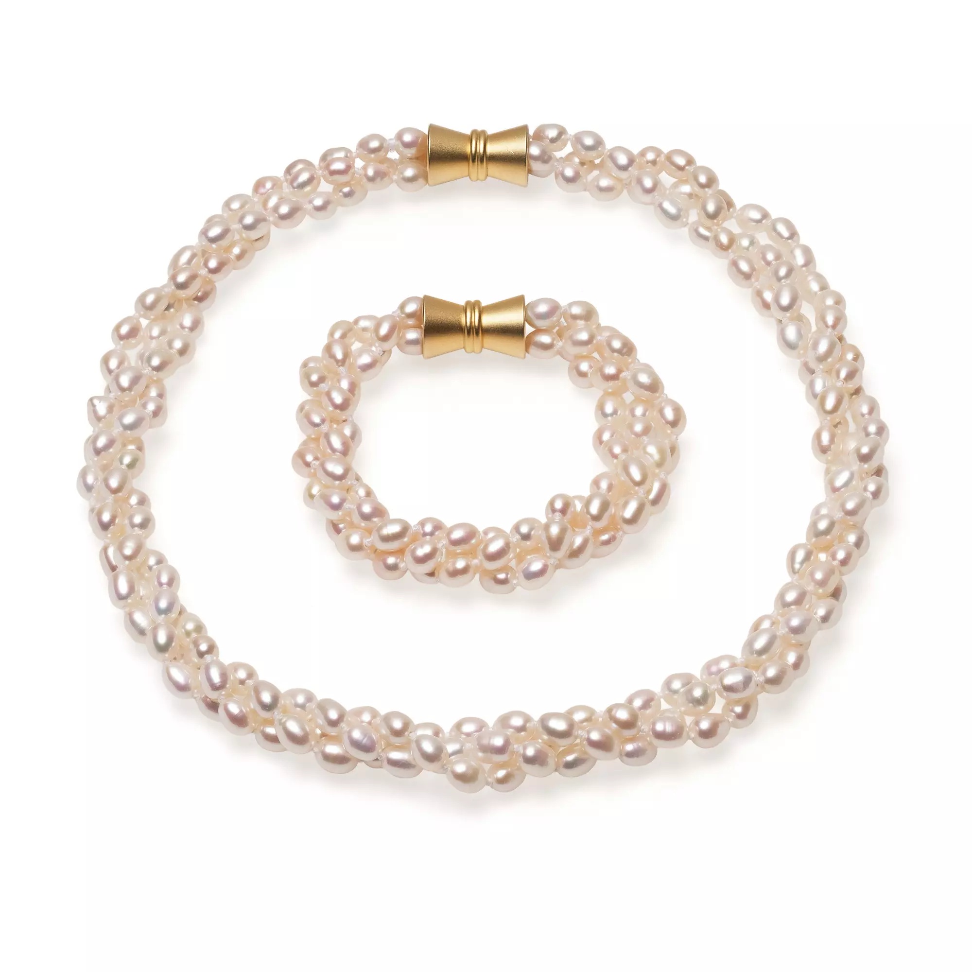 Brățară de Lux cu 3 Rânduri de Perle Albe și Închizătoare Magnetică Aurie