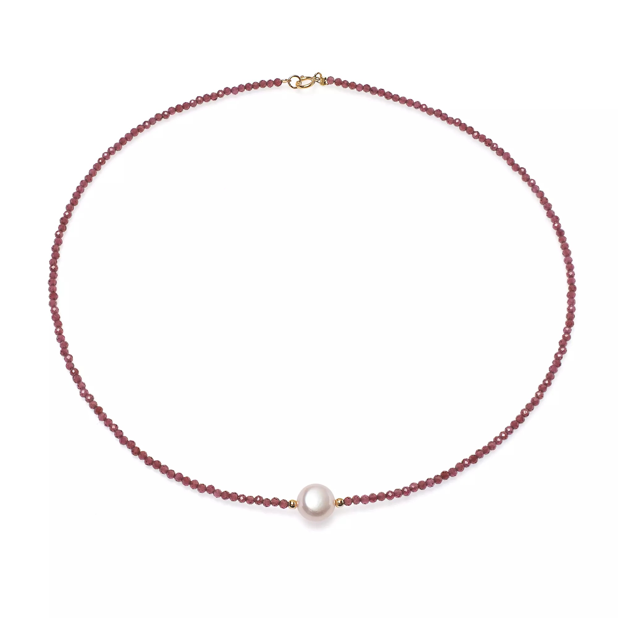 Adaugă o notă de mister și rafinament garderobei tale cu acest colier sofisticat, care îmbină strălucirea profundă a pietrelor de garnet cu puritatea unei perle naturale spectaculoase. Este o piesă de bijuterie statement, dar delicată, concepută pentru a atrage toate privirile.