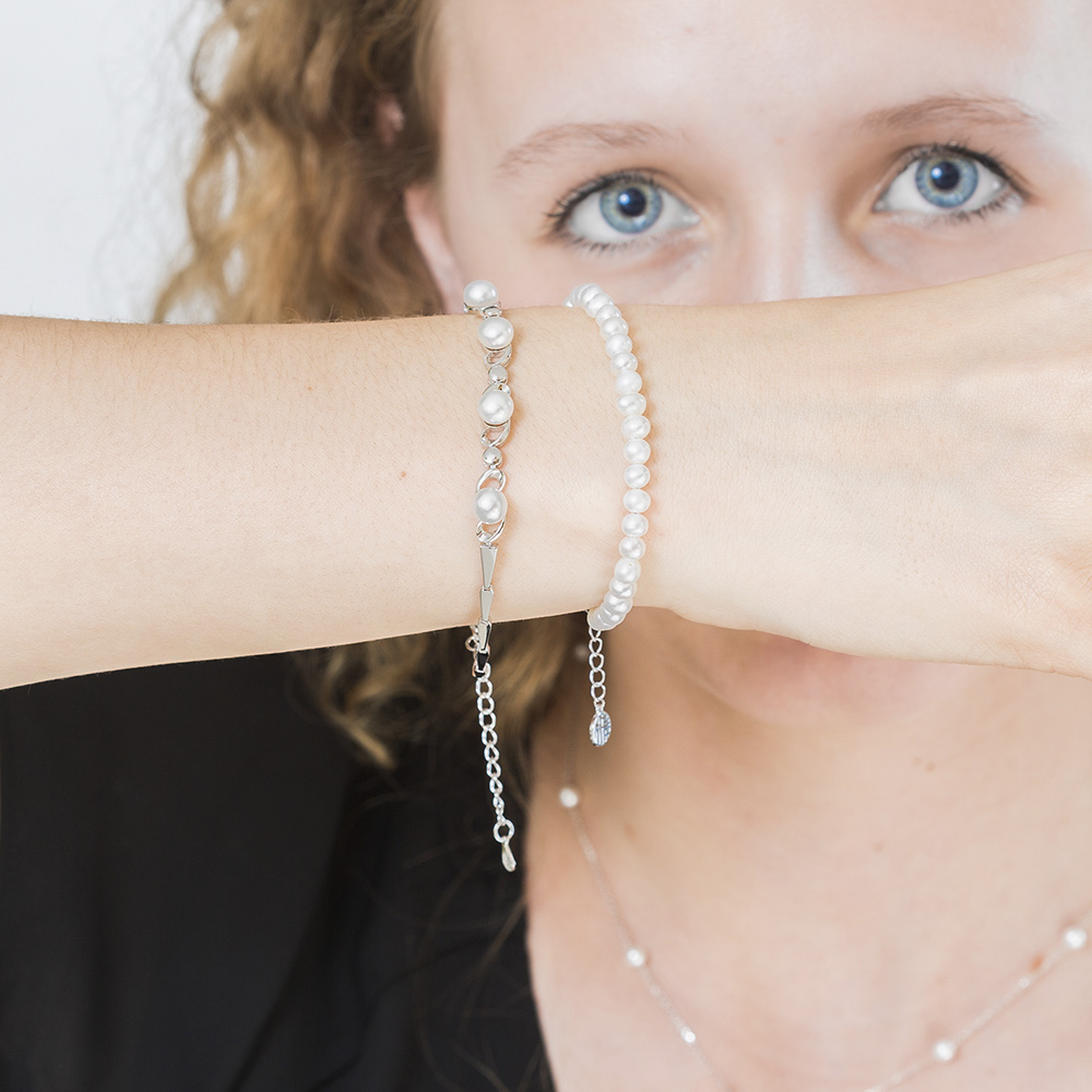 Această brățară este simbolul eleganței eterne, combinând strălucirea nobilă a argintului rodiat cu puritatea perlelor naturale de cultură. Designul său fluid și feminin face din acest accesoriu o piesă indispensabilă în colecția oricărei doamne, fiind perfectă pentru a adăuga o notă de rafinament discret ținutelor de zi cu zi sau celor de ocazie.