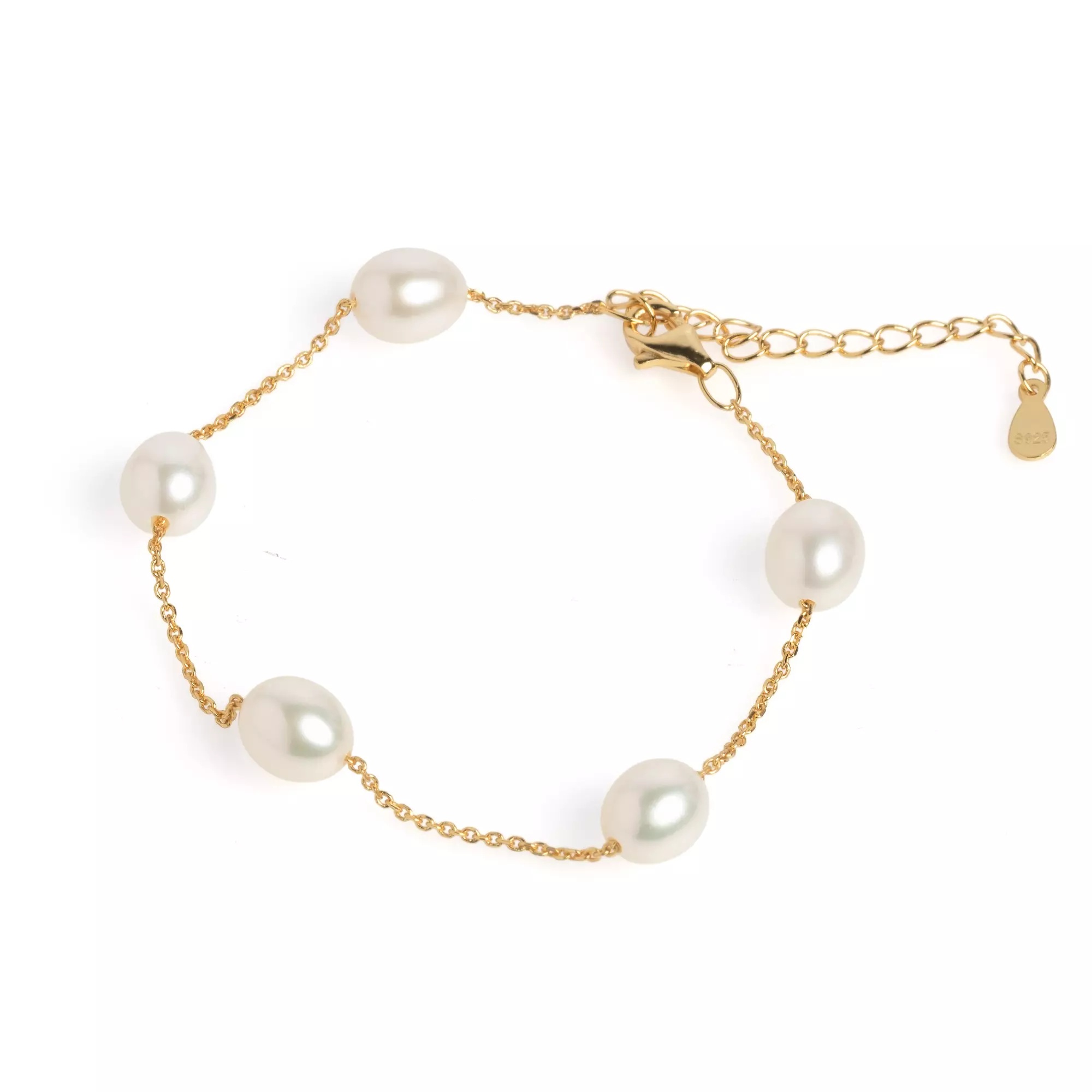 Brățară „Firul Radiant”: 5 perle albe pe lanț din argint aurit