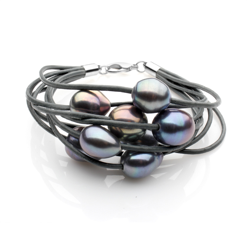 Brățară cu 8 rânduri de piele gri, 8 perle mixte, 11-12mm