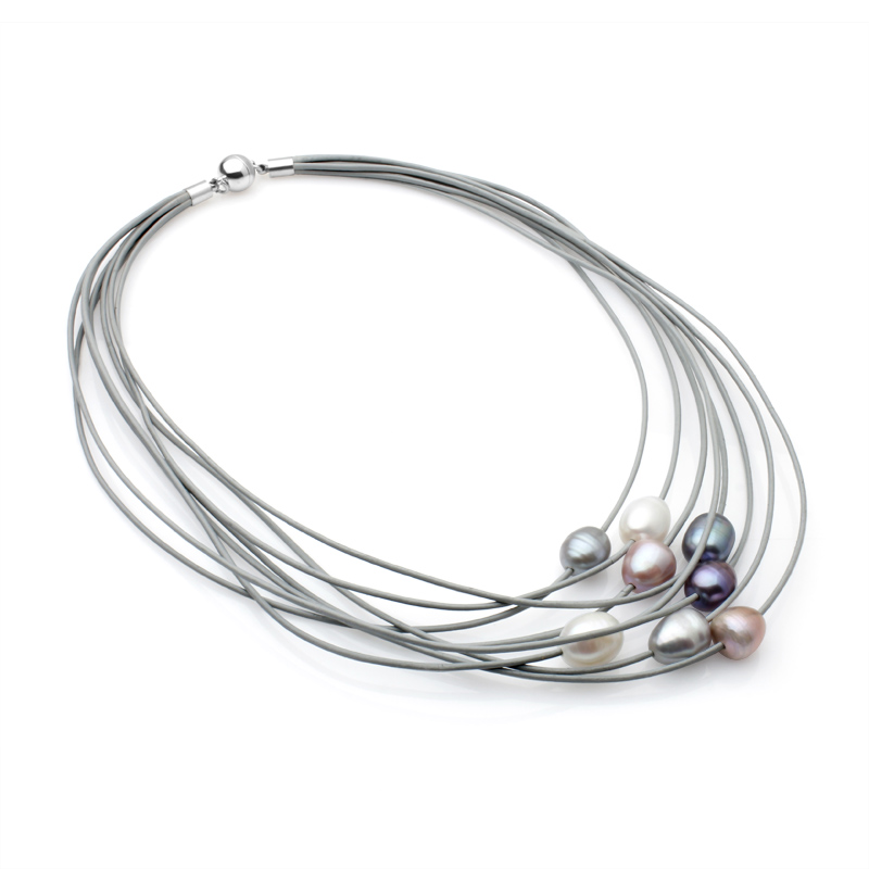 Acest colier elegant îmbină simplitatea modernă cu farmecul natural al perlelor. Este alcătuit din 8 rânduri fine de piele gri, care se așază delicat la baza gâtului, oferind o textură suplă și un aspect contemporan.